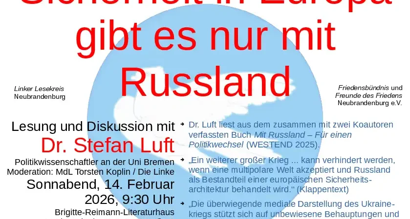 Dr. Luft liest aus dem zusammen mit zwei Koautoren verfassten Buch “Mit Russland ‒ Für einen Politikwechsel” (WESTEND 2025). Sonnabend, 14. Februar 2026, 9:30 Uhr Brigitte-Reimann-Literaturhaus Neubrandenburg, Gartenstraße 6 Eintritt frei!